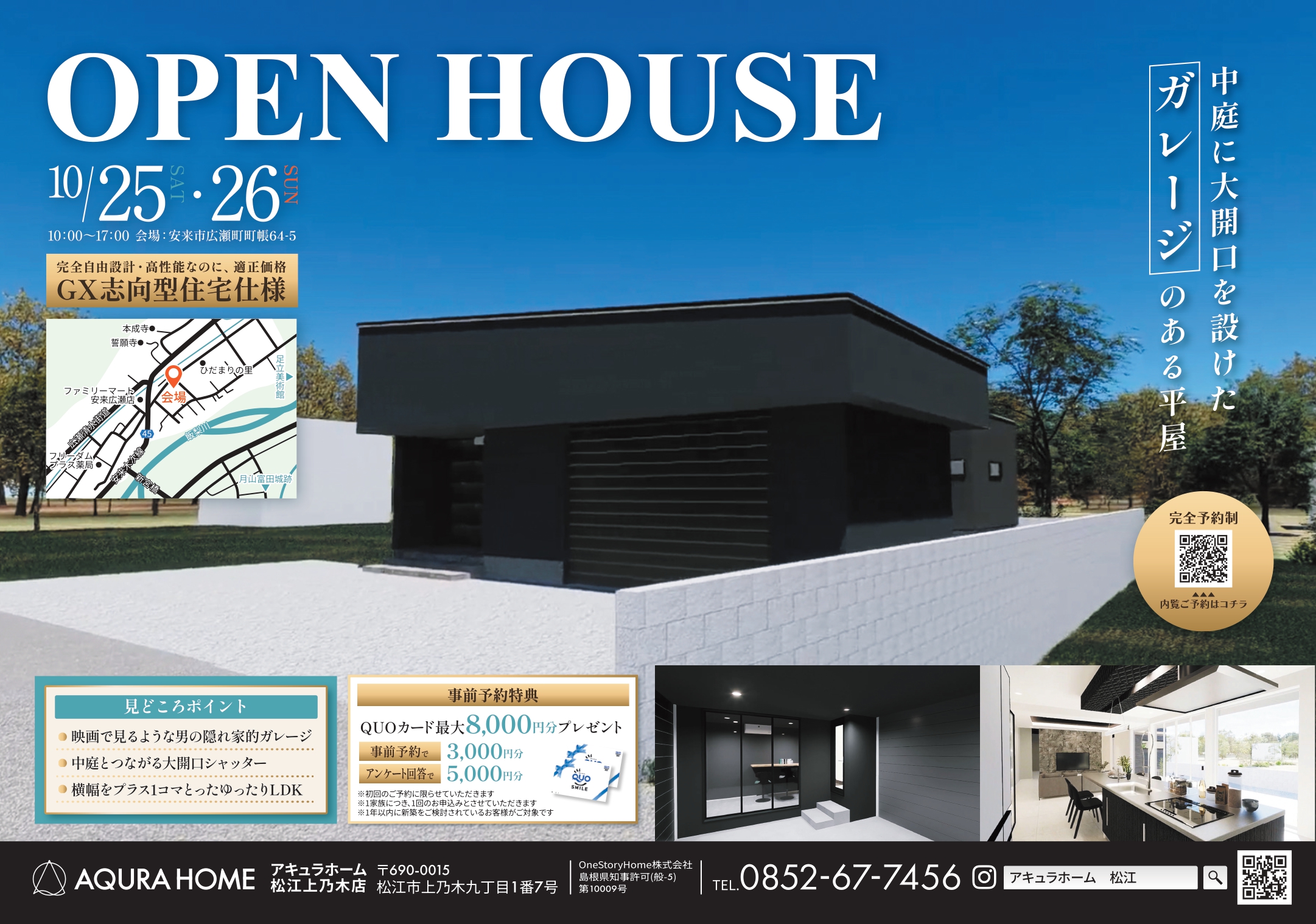 10/25(土),26(日) 完成見学会開催【中庭に大開口を設けた ガレージのある平屋】